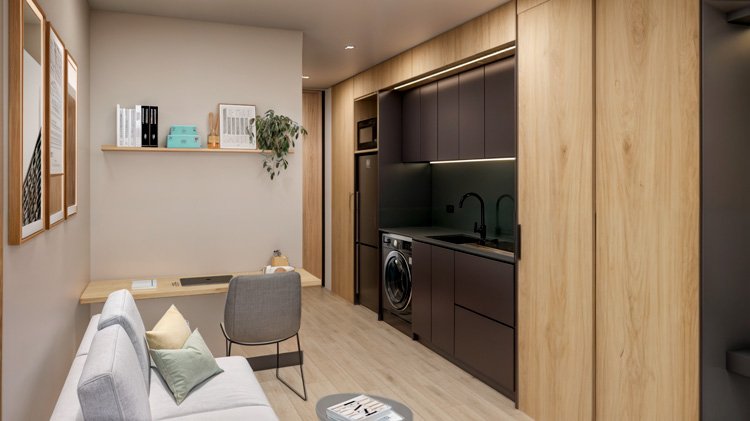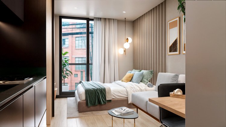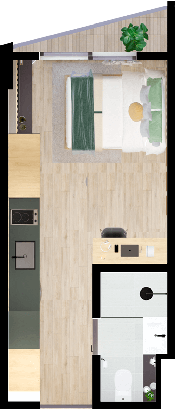Este apartamento cuenta con una zona única y abierta que integra cocina, escritorio y alcoba en un mismo ambiente, ideal para quienes valoran la practicidad. El acceso directo a una terraza tipo balcón agrega amplitud y conexión con el exterior, perfecto para vivir solo o invertir en renta corta.